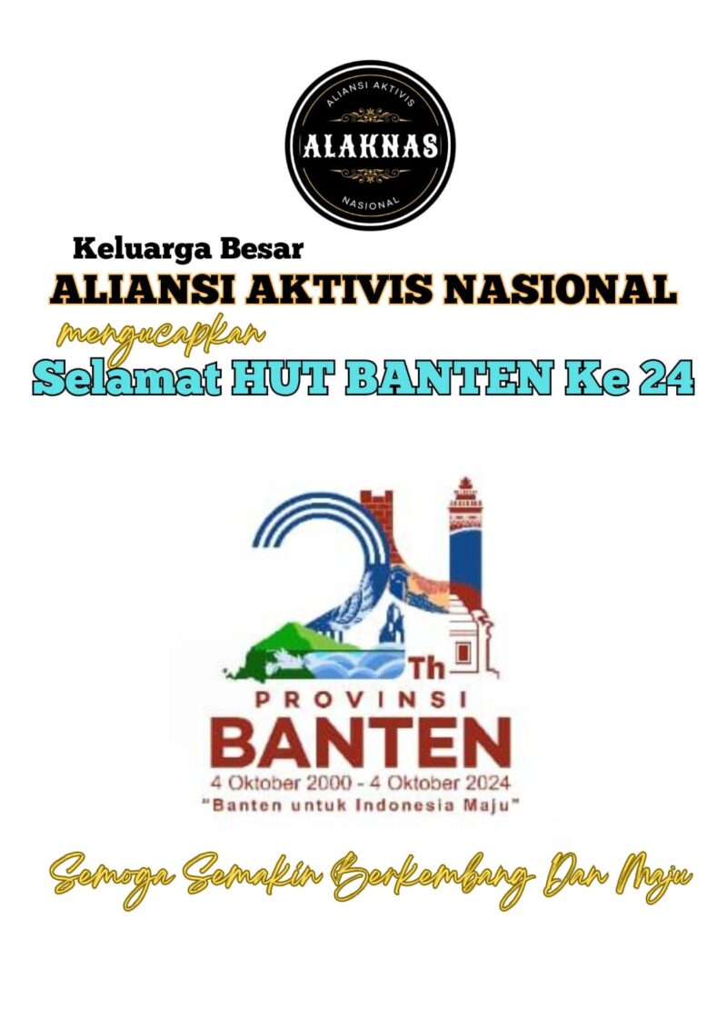 SorotanPena.com|Aliansi Aktivis Nasional (Alaknas) mengucapkan selamat Hut Banten yang ke 24 Tahun yang mana di usia yang menginjak remaja ini Provinsi Banten di harapkan agar lebih baik lagi serta mampu menjadi Daerah unggul dalam segala aspek apalagi untuk ke sejahteraan masyarakatnya.